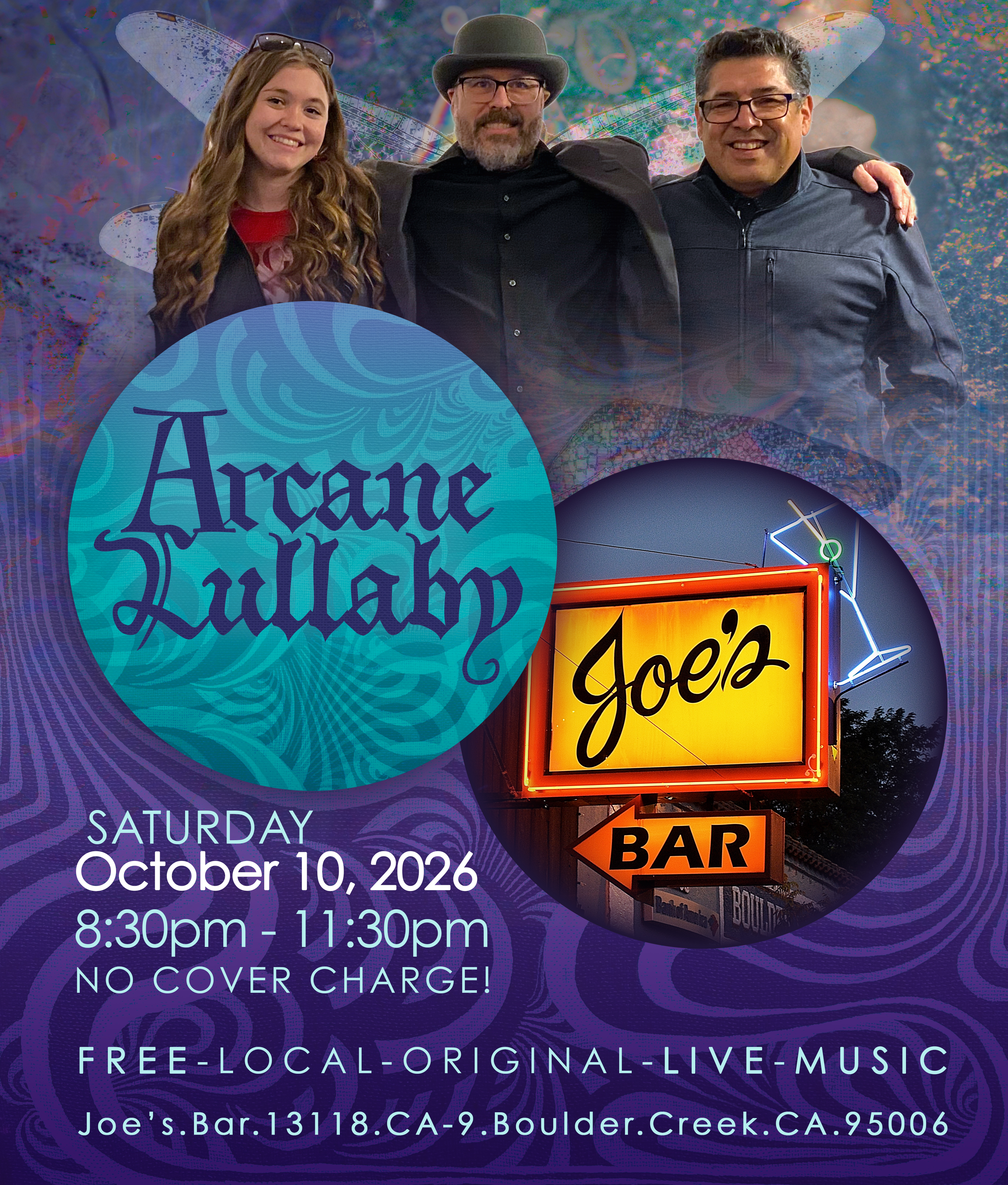 Saturday October 10, 2026, 8:30pm - 11:30pm - Joe's Bar - 13118 CA-9, Boulder Creek, CA 95006 - Click here for poster