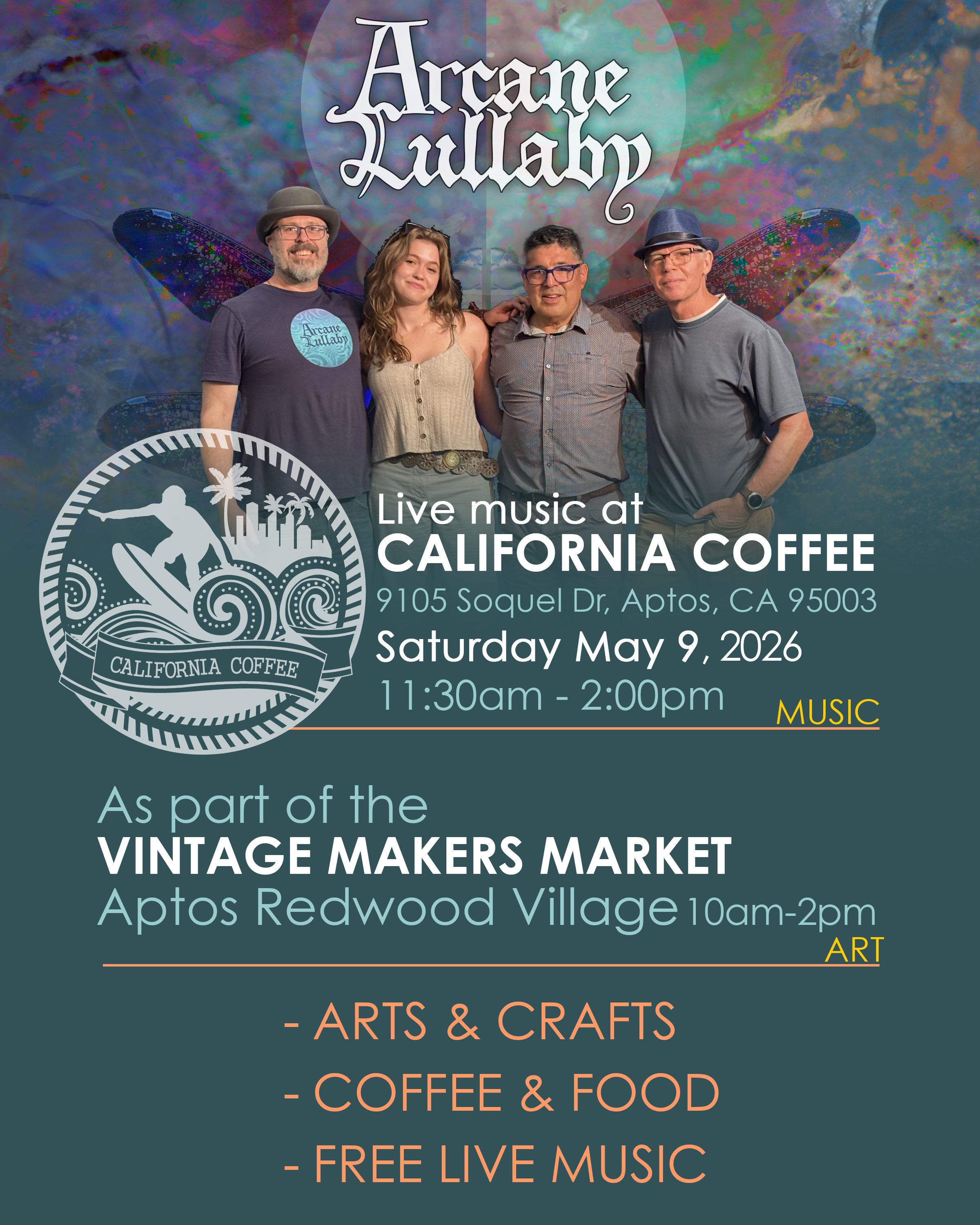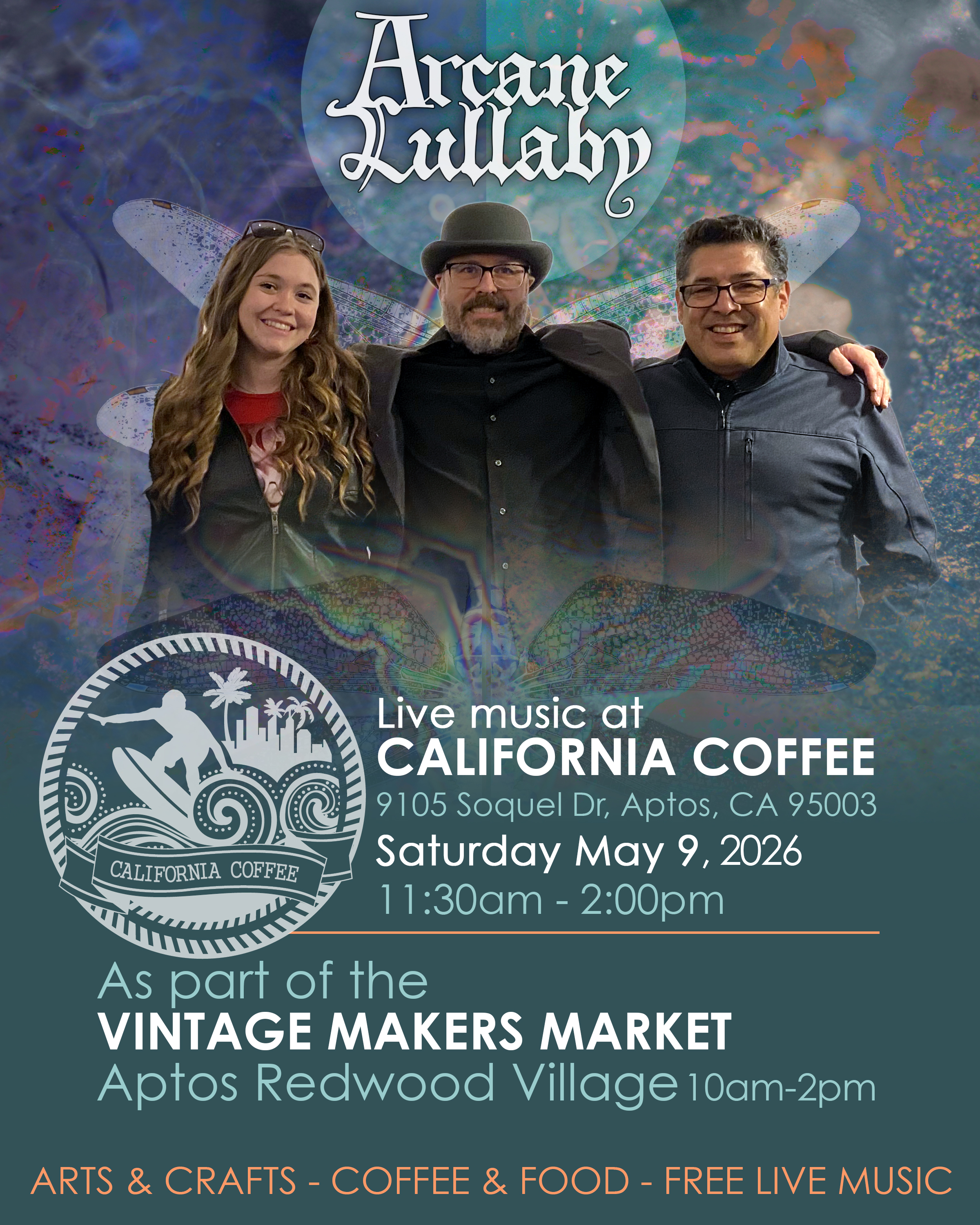 Saturday May 9, 2026, 11:30am - 2:00pm - California Coffee - 9105 Soquel Dr, Aptos, CA 95003 - Click here for poster