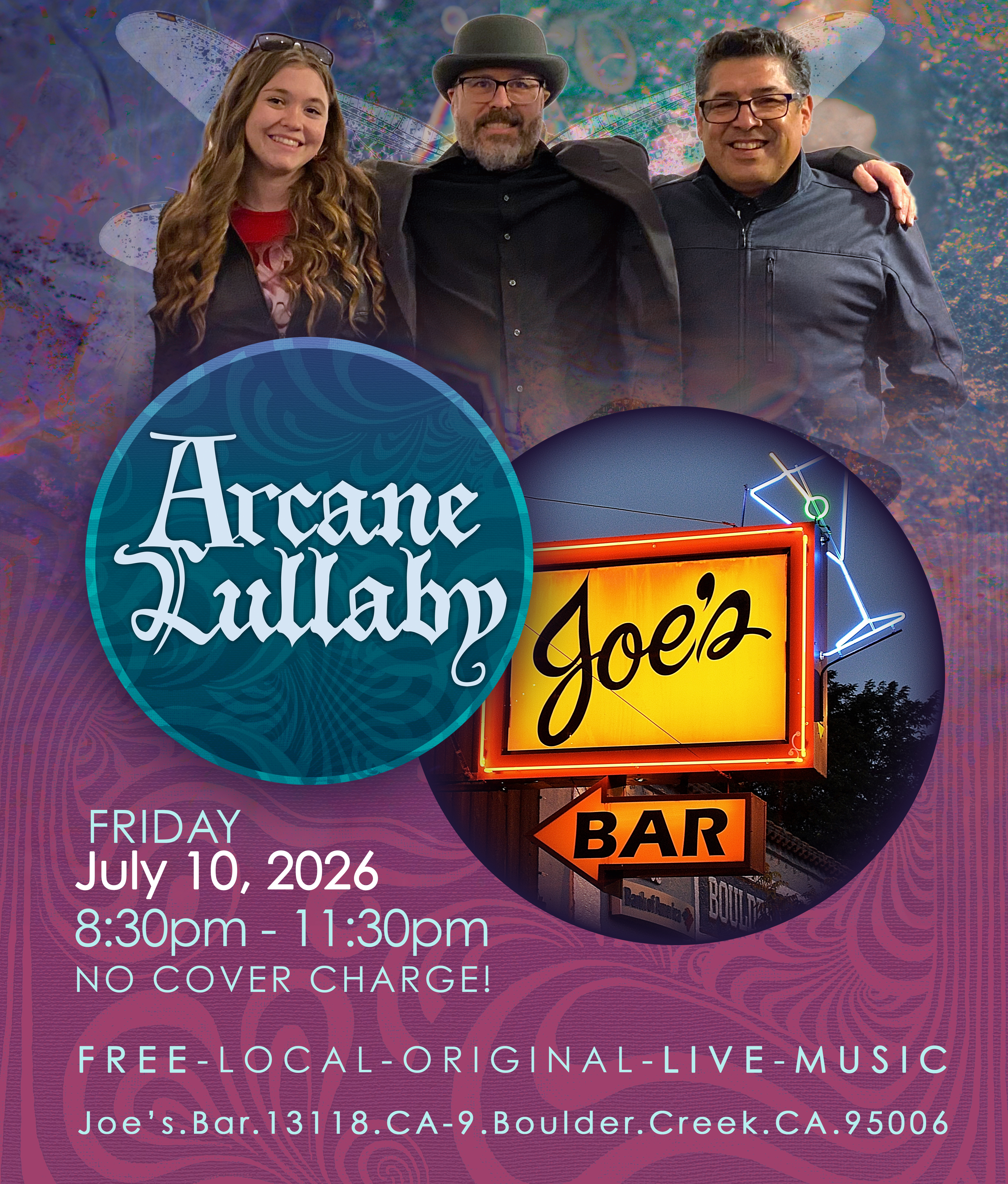 Friday July 10, 2026, 8:30pm - 11:30pm - Joe's Bar - 13118 CA-9 Boulder Creek, CA 95006 - Click here for poster